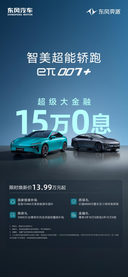 “智美超能轿跑”eπ007+在2025年展现出强劲的市场竞争力,其凭借14万级唯一搭载激光雷达的四驱轿跑硬核实力,成为年轻人的第一台“百万”级四驱轿跑,跻身众多年轻用户的价值首选。基于eπ007+打造的ETCR赛车更以“六连冠”的全胜战绩,强势赢得首届ETCR赛事年度总冠军,为品牌注入了浓厚的运动基因。2026年开局,eπ007+推出15万元0息的超大金融福利,限时焕新价13.99万元起,助力更多年轻人轻松拥有梦想座驾。与此同时,eπ007限时焕新价11.59万元起,购车限时享至高价值40000元购车权益,带来更加好玩好开的潮流体验。
