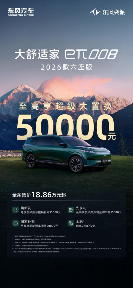 定位“大舒适家”的eπ008,在2025年凭借越级体验稳坐15-20万级新能源中大型SUV销量第一阵营,圈粉众多家庭用户,彰显了其在产品安全与舒适层面的卓越实力。针对家庭用户对购车成本与用车保障的双重关注,eπ008量身打造了贴心解决方案。其中,eπ008六座版至高享超级大置换50000元权益,全系售价18.86万元起;eπ008五座版限时焕新指导价15.99万元起,尊享15000元置换补贴及多重好礼,不仅减轻家庭购车压力,也让更多家庭能够安心享受高品质的新能源出行体验。
